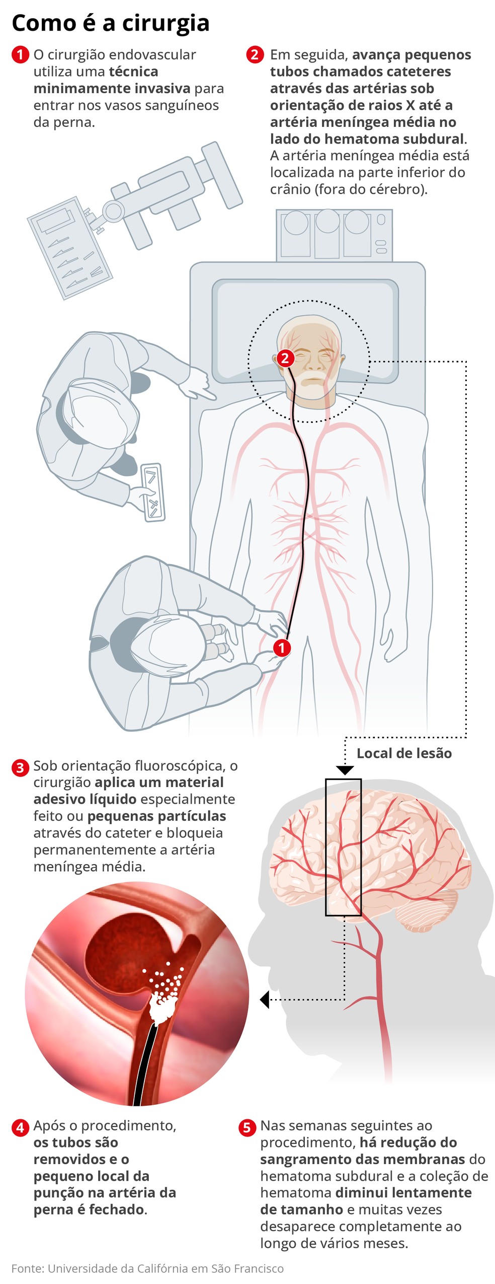 A intervenção,prevista para começar às 7h,deve durar cerca de uma hora e será realizada na sala de cateterismo,e não no centro cirúrgico. Será feita uma punção na virilha,por onde um cateter será introduzido até o local onde ocorrerá a embolização,o que pode ser feito sob sedação ou anestesia geral — a decisão será feita no momento do procedimento. A técnica costuma ser adotada na maioria dos pacientes que se submetem a drenagem de hematoma cerebral,caso de Lula.