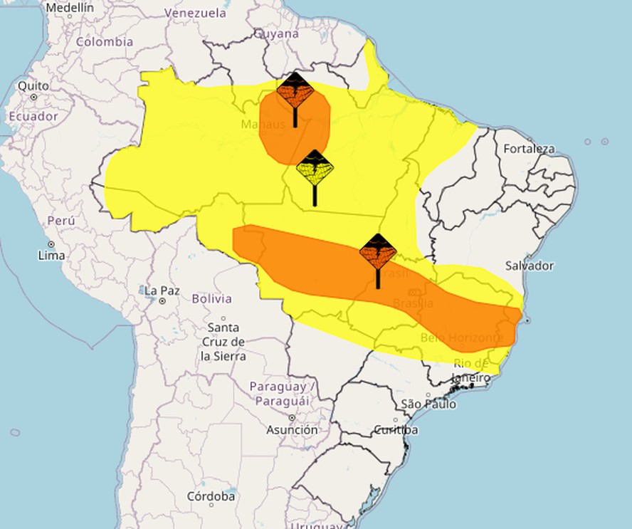 Já os outros dois avisos de "Perigo Potencial",na cor amarela,cercam os estados do Acre,Amapá,Amazonas,Maranhão,Mato Grosso do Sul,Pará,Rio de Janeiro,Rondônia,Roraima,São Paulo e Tocantins,e também o Distrito Federal. A perspectiva é de ventos intensos,baixo risco de corte de energia elétrica,queda de galhos de árvores,alagamentos e de descargas elétricas.