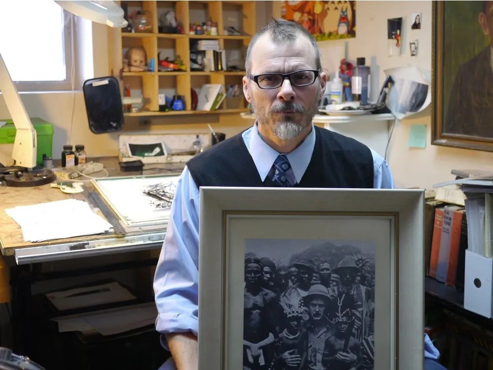 Joe Ollmann com uma foto de Seabrook rodeado de nativos,na África — Foto: Divulgação