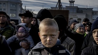Registro do húngaro András D. Hajdú,a imagem ficou em primeiro lugar no concurso. Ela mostra um garoto de 13 anos ouvindo um discurso do presidente ucraniano Volodymyr Zelenski em meio a multidão — Foto: Andras D. Hajdu/Siena International Photo Awards