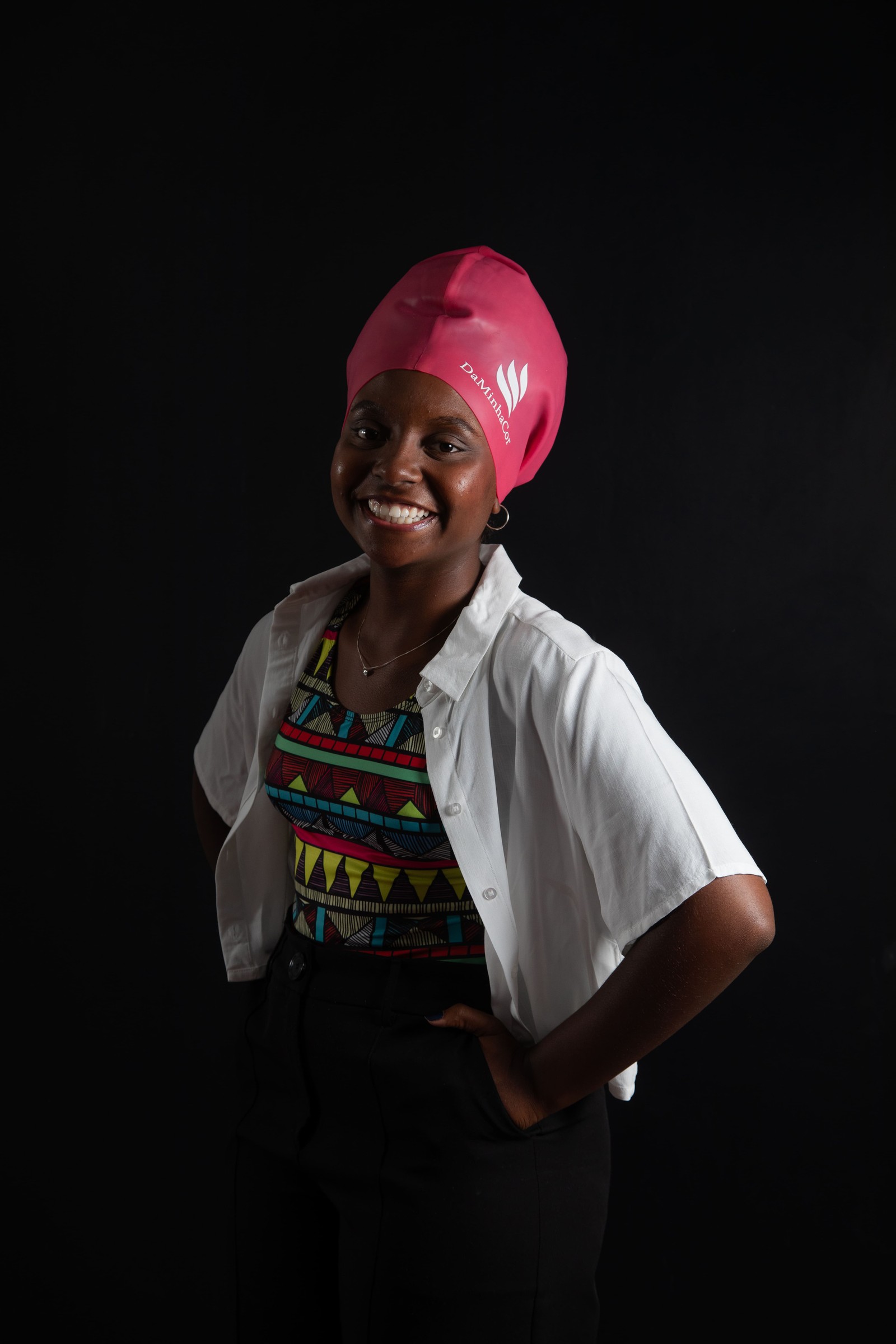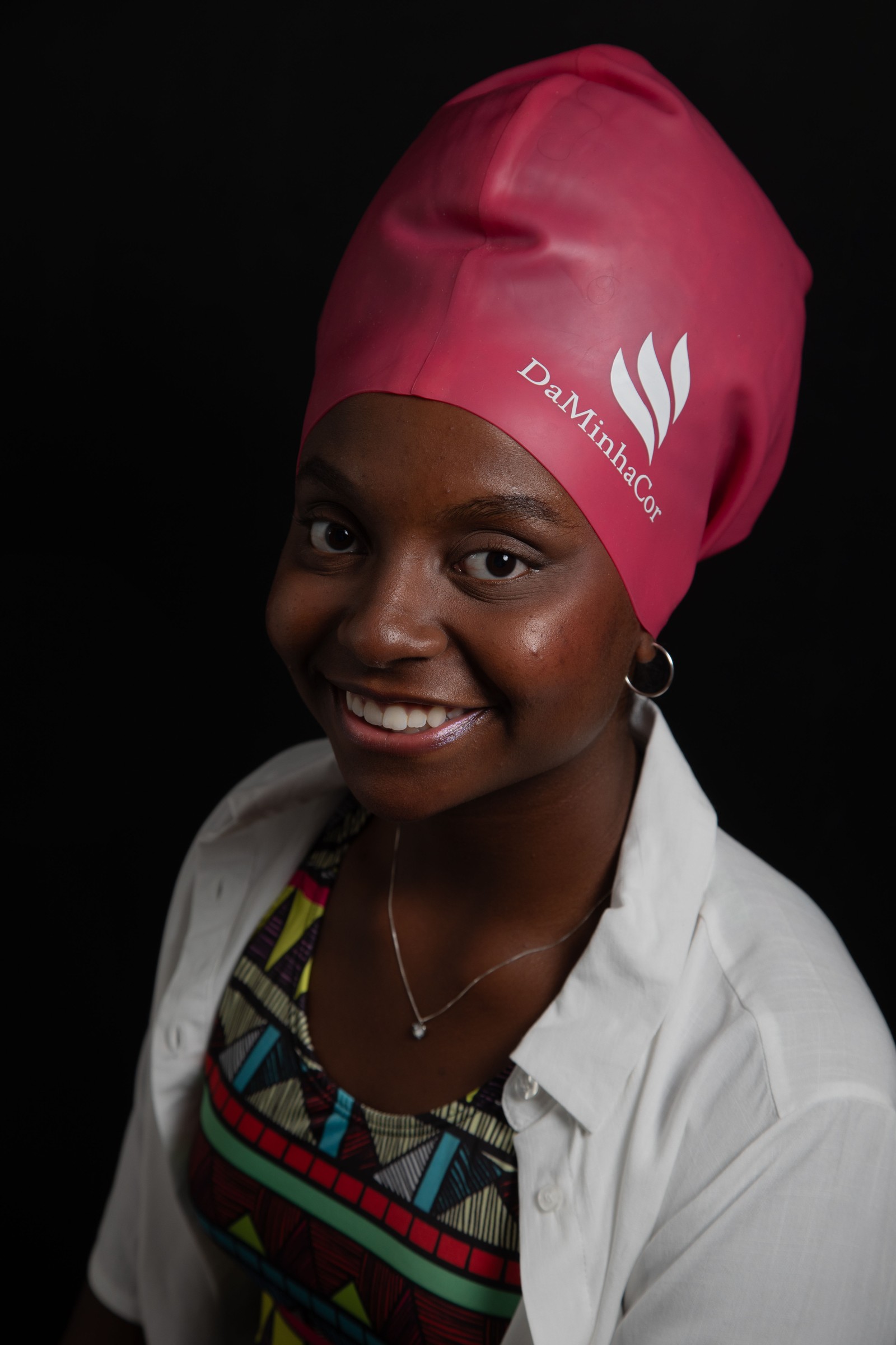 A estudante Sofia Dionizio usando touca e maiô da marca Da Minha Cor — Foto: Edilson Dantas/O Globo