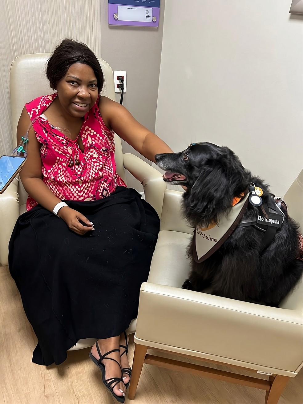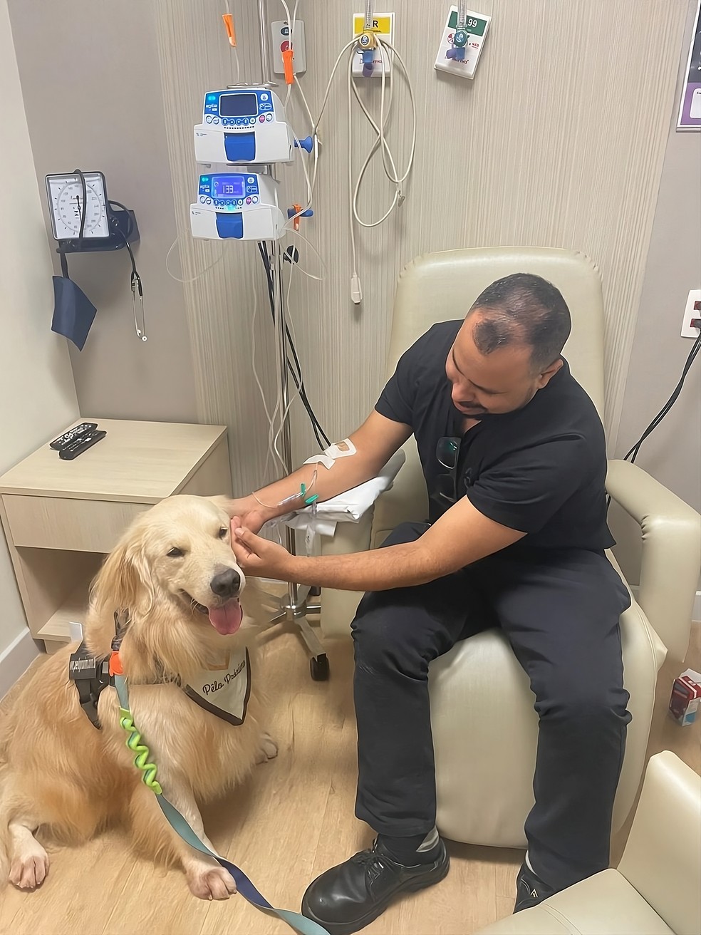 Dasa Oncologia.Paciente faz carinho em Bento enquanto recebe tratamento na unidade na Gávea — Foto: Divulgação/Pêlo Próximo