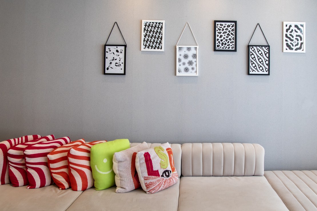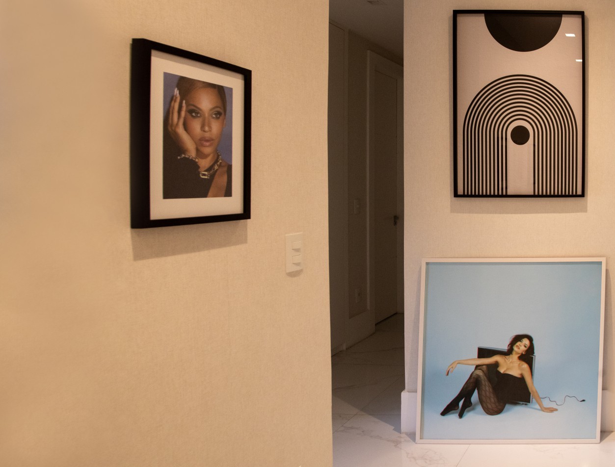 Vitória Strada usa seus desenhos para decorar o apartamento — Foto: Ana Branco/Agência O Globo