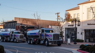Bombeiros trabalham em trecho da Sunset Boulevard — Foto: Apu Gomes/Getty Images/AFP