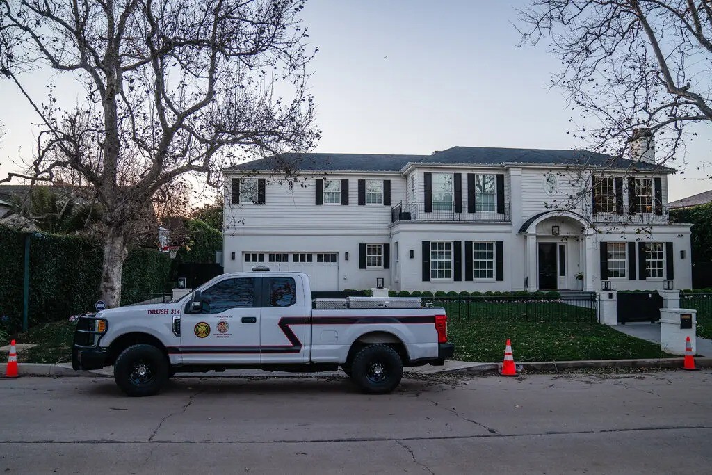 Viatura estacionada em frente à casa que não foi atingida durante incêndios em Los Angeles — Foto: Ariana Dehsler/The New York Times