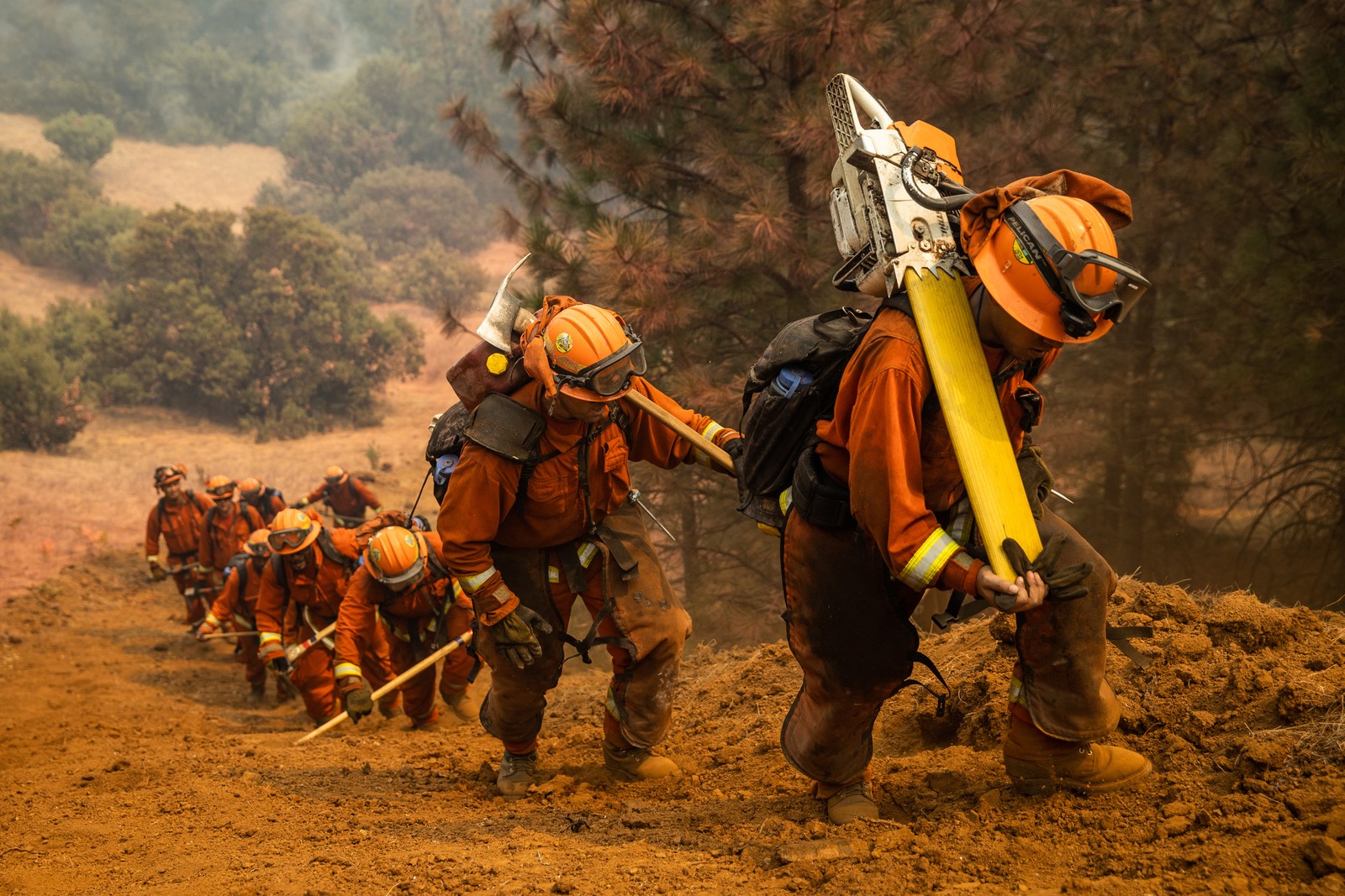 Bombeiros presos limpando uma linha de fogo no incêndio de Walbridge,perto de Healdsburg,durante o incêndio do Complexo LNU,em 23 de agosto de 2020 — Foto: Max Whittaker/The New York Times