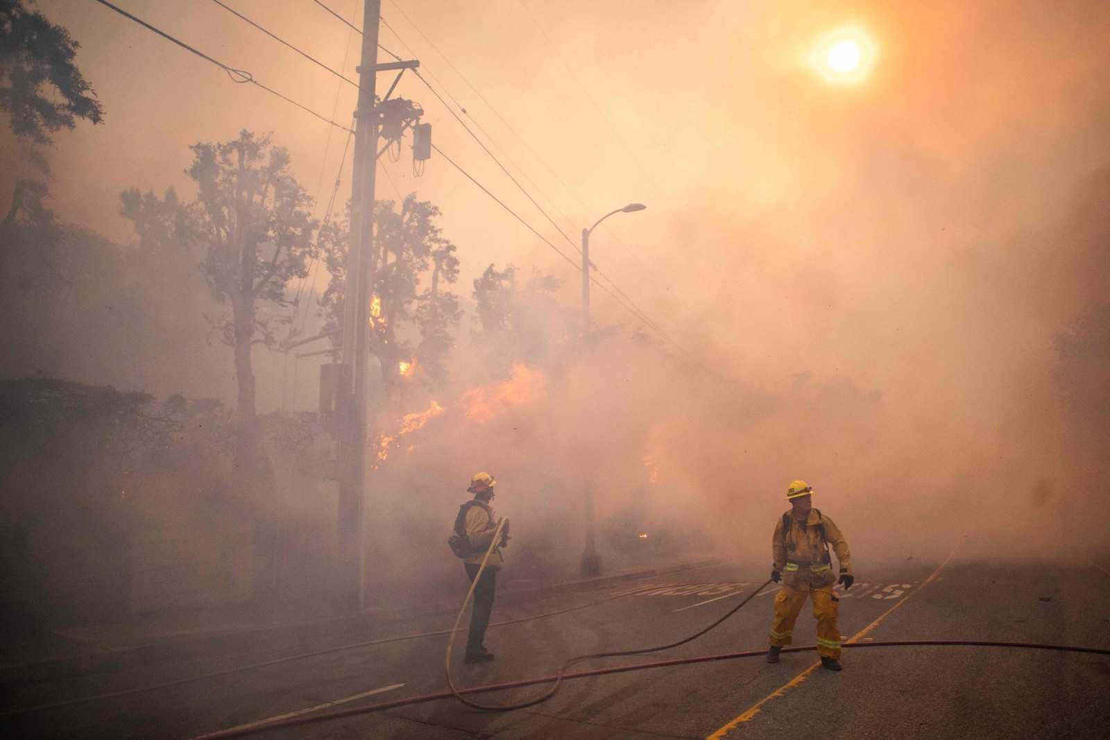 Bombeiros combatem incêndio em frente a uma casa em chamas em Los Angeles,em 8 de janeiro de 2025 — Foto: Justin Sullivan/Getty Images/AFP