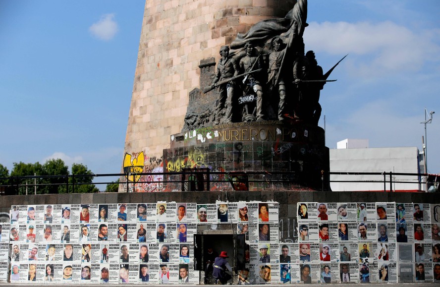 Fotos de vítimas do tráfico de drogas cobrem muro em Guadalajara,no México,em 2021 — Foto: ULISES RUIZ/AFP/24-8-2021