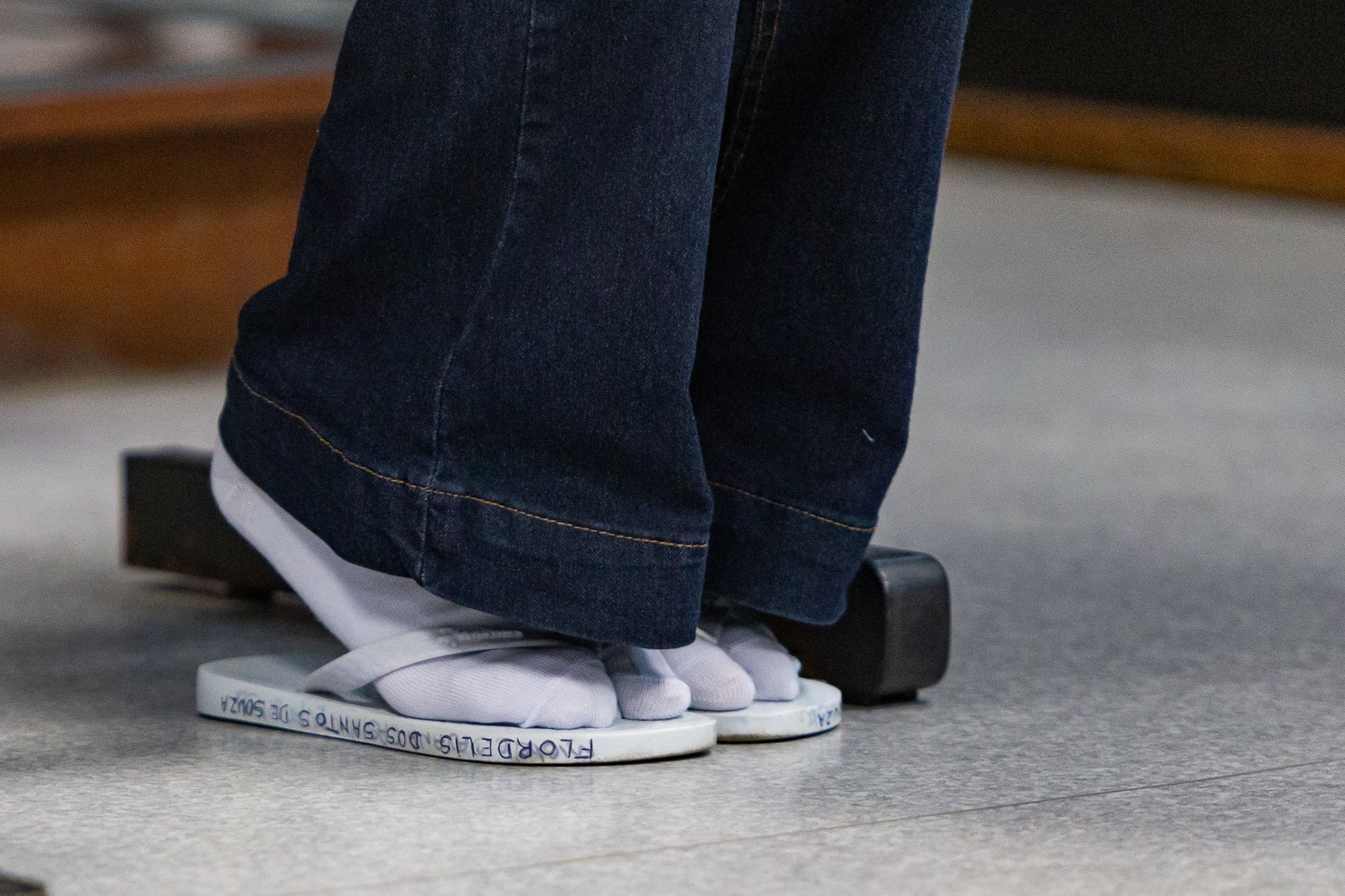 Flordelis usa chinelo de dedo identificado com o nome — Foto: Bruno Dantas/TJ-RJ