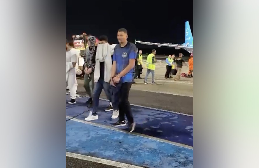Reprodução de vídeo mostra deportados dos EUA chegando algemados e com pés acorrentados ao Brasil — Foto: Agência Cenarium