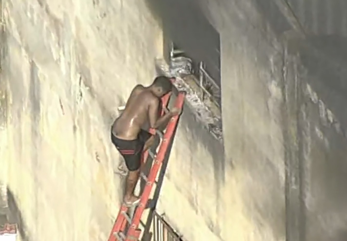 Vítima de incêndio consegue deixar prédio de confecção de roupas em Ramos — Foto: Reprodução TV Globo
