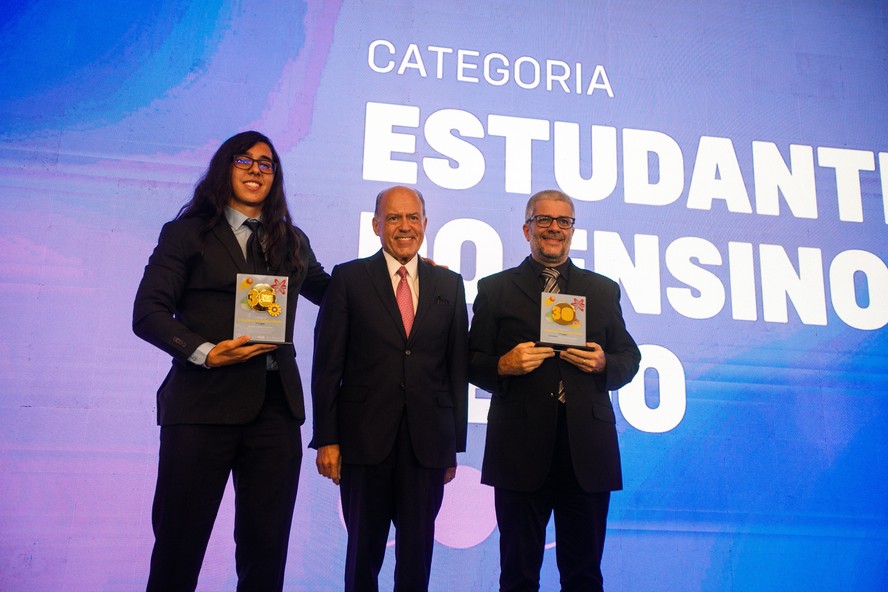 À esquerda,3º lugar na Categoria Estudante do Ensino Médio,Maysa Grazielle dos Santos,Paulo Tonet Camargo — Foto: Brenno Carvalho