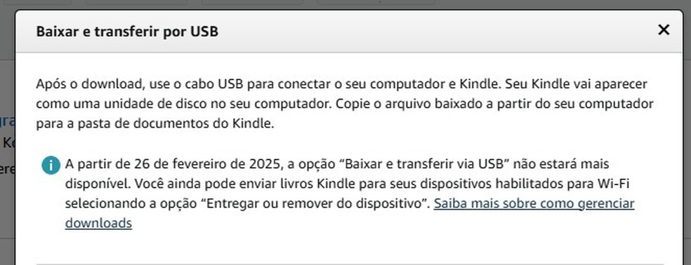 A informação sobre o fim da função é exibida como uma notificação para os usuários que tentam fazer o download via USB.