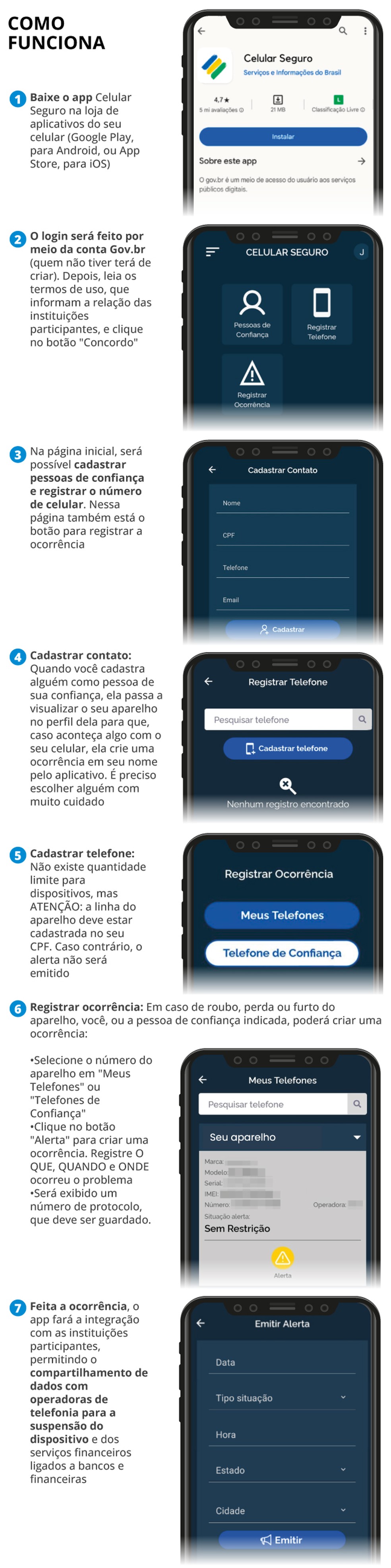 A iniciativa do governo Federal possibilita ao usuário cadastrar seu número pelo site ou pelo aplicativo disponível para Android e iOS. Em caso de furto,roubo ou perda,a vítima pode bloquear o aparelho e os aplicativos financeiros. Durante o cadastro,é possível adicionar “pessoas de confiança” que poderão acionar o alerta caso o titular não consiga realizar a ação.