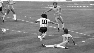Maradona tenta passar pelo volante brasileiro Falcão na derrota de 3 a 1 para o Brasil,no Estádio Sarriá,em Barcelona — Foto: Erno Schneider/Agência O Globo