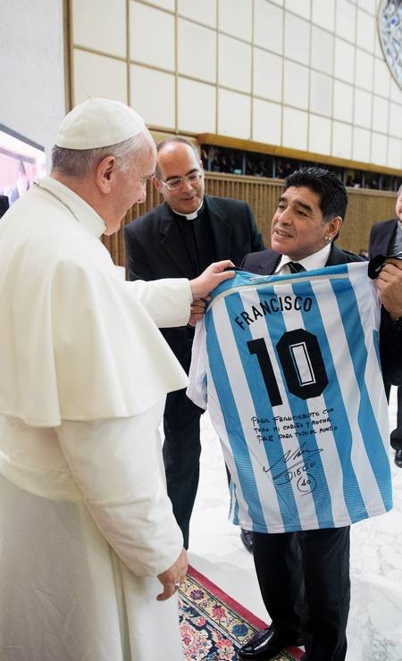 Diego Armando Maradona presenteia o compatriota Papa Francisco durante uma reunião com organizadores,jogadores e convidados da partida inter-religiosa "jogo pela paz",no salão Paulo VI,no Vaticano — Foto: Handout/AFP
