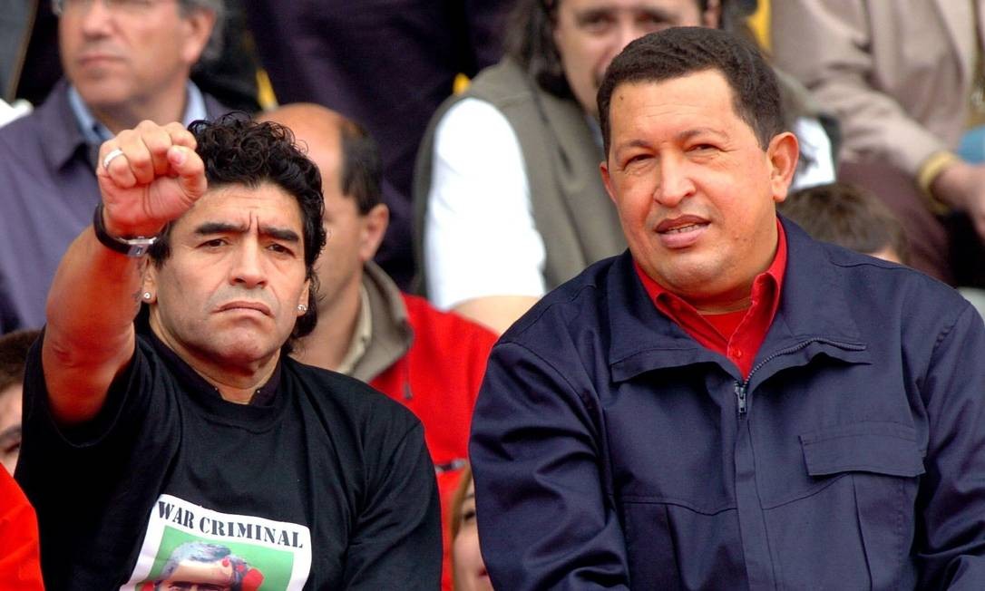 Maradona,acompanhado do presidente venezuelano Hugo Chávez,participou de ato contra a Área de Livre Comércio das Américas (ALCA) e a presença do presidente dos Estados Unidos,George W. Bush,na IV Cúpula do Américas,em 2005 — Foto: Ivan Franco/Arquivo