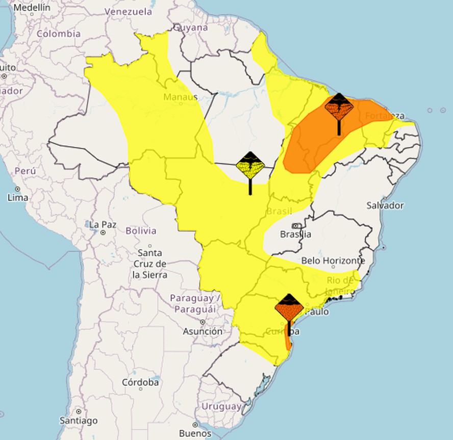 Um aviso na escala laranja,de "Perigo",indicam chuvas entre 50 e 100 mm/dia e ventos intensos de até 100 km/h nas regiões Norte e Nordeste. Os estados afetados são Ceará,Piauí e Tocantins.