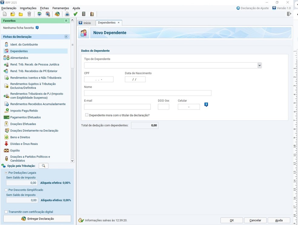 A próxima ficha é de "Dependentes". Ela deve ser preenchida com os dados de cada dependente do contribuinte,como nome,CPF,e-mail,telefone e data de nascimento.