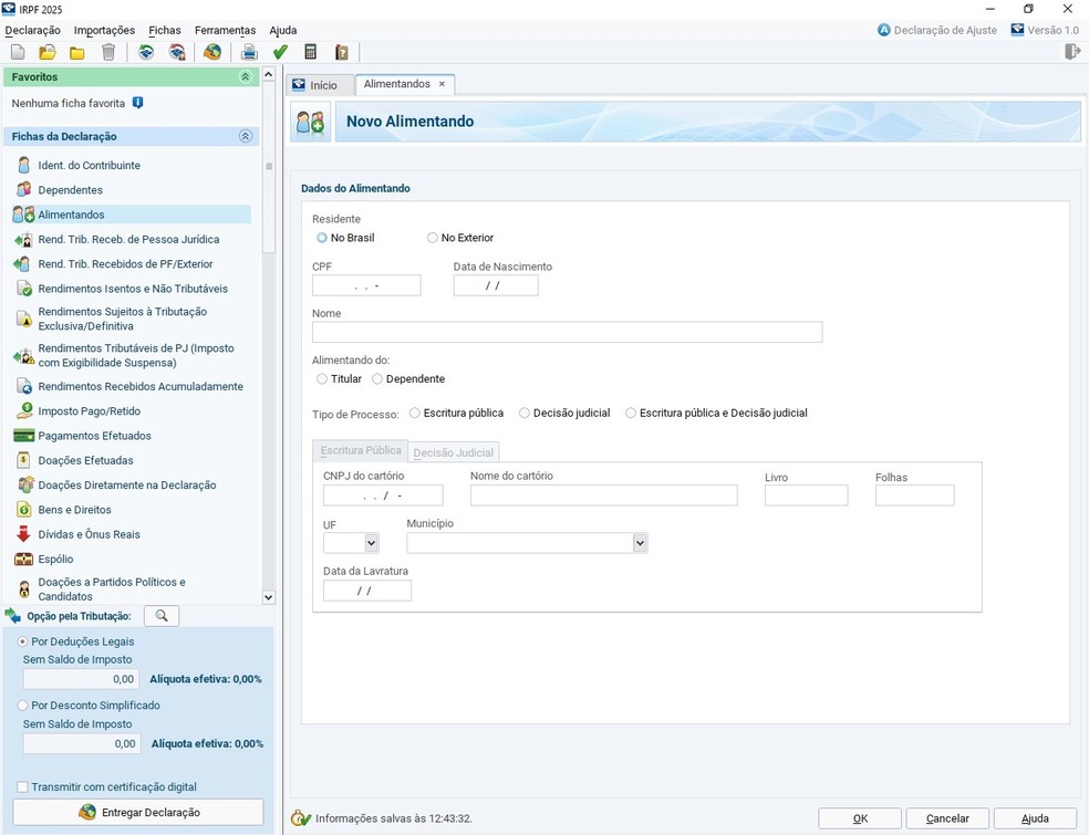 A ficha seguinte é a "Alimentandos",que diz respeito aos beneficiários de pensão alimentícia judicial ou decidida num acordo feito por escritura pública. Nesta aba,é preciso adicionar as informações do Alimentando,com o CPF do beneficiário passando a ser obrigatório.