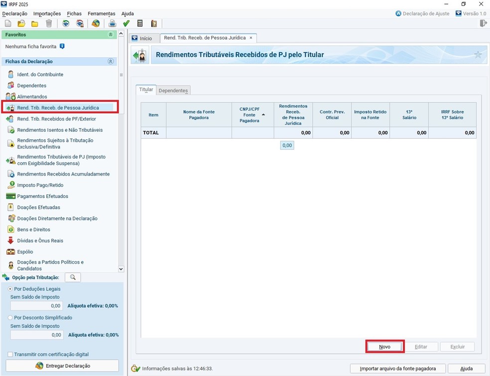 Nesta aba é preciso incluir rendimentos como salários e aposentadoria. Caso tenha mais de uma fonte pagadora,você deve preencher uma ficha diferente para cada uma,clicando em "Novo",no canto inferior direito da tela.