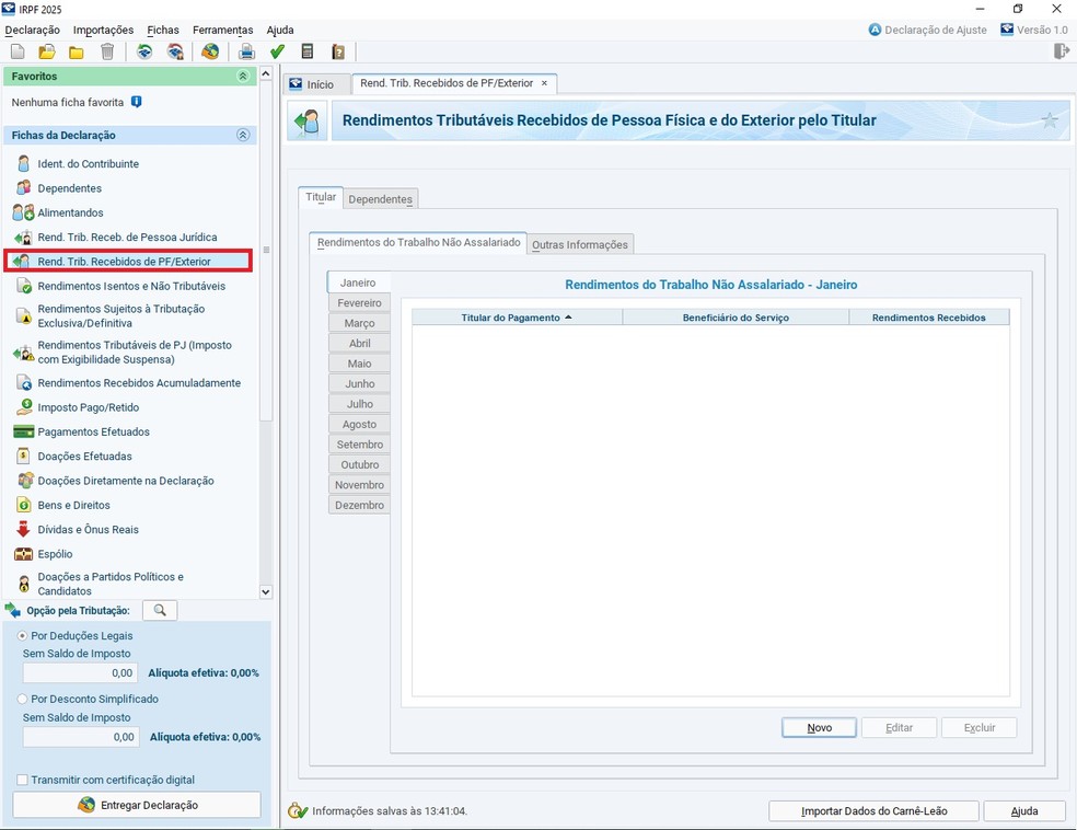 É nesta ficha,na aba "Titular",que você deve informar os valores que constam no informe de rendimentos entregue pela empresa. Caso não tenha recebido,é possível solicitar ao RH ou consultá-los no Portal e-CAC. Para os aposentados,o documento pode ser obtido por meio do aplicativo "Meu INSS".