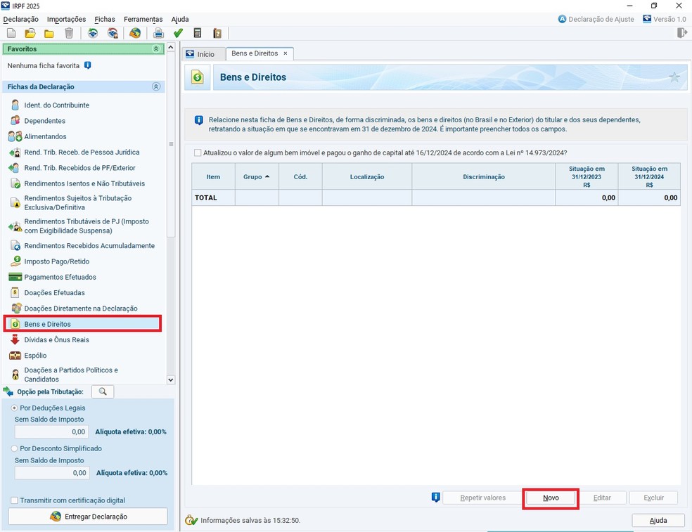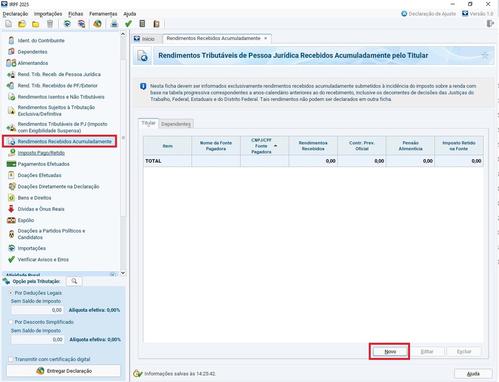 Para informar Rendimentos recebidos acumuladamente na declaração,clique em "novo" — Foto: Reprodução