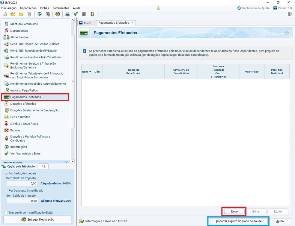É nesta ficha que devem ser informadas as despesas dedutíveis do IR 2025. Clicando em "Novo",no canto inferior direito,uma tela com os códigos de todos os serviços passíveis de abatimento no Imposto de Renda são listados.