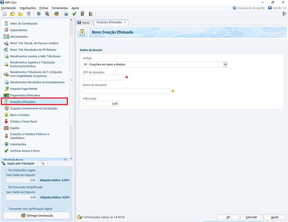 Para quem realizou doações no ano passado,é possível adicionar os valores na aba "Doações Efetuadas". Dentro da ficha,o programa apresenta as diversas opções que podem ser utilizadas para dedução de impostos,como incentivos à cultura,esportiva,ao incentivo audiovisual,ao ECA e ao Projeto Nacional de Apoio à Atenção Oncológica (Pronon).