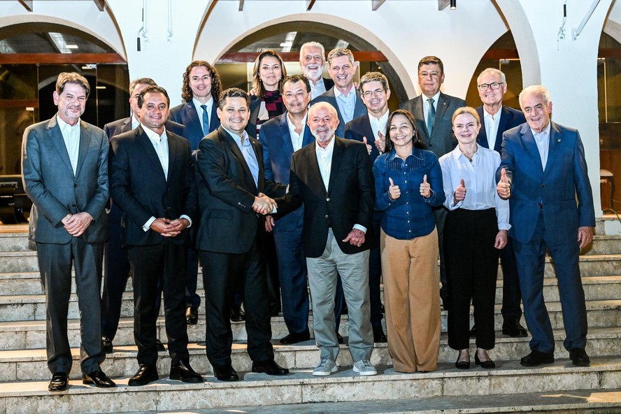 Presidente Luiz Inácio Lula da Silva junto com o presidente do Senado,Davi Alcolumbre (União-AP) e demais senadores em encontro na Residência Oficial da Presidência do Senado,em Brasília — Foto: Ricardo Stuckert/Presidência da República