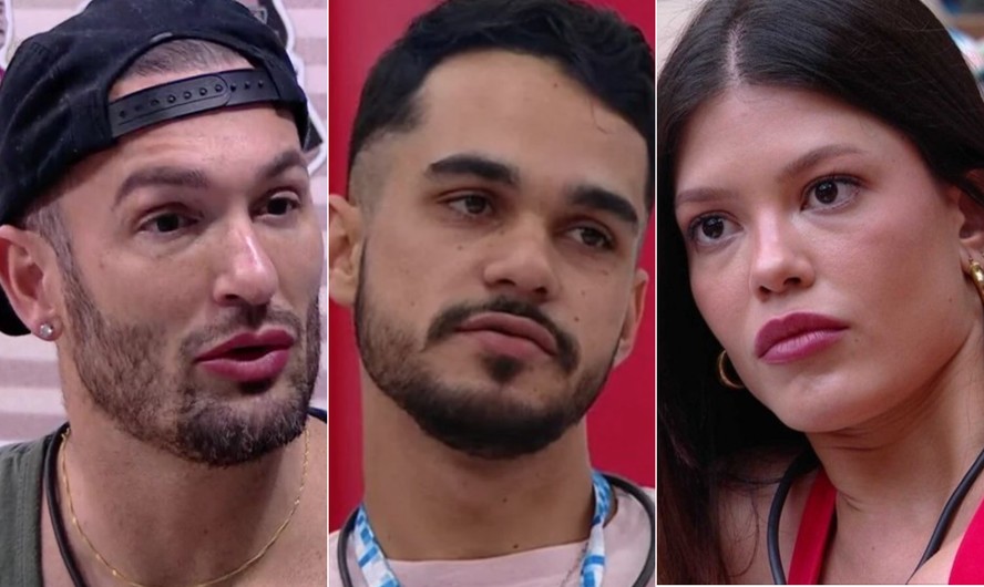 Da esquerda para a direita,Diego Hypolito,João Gabriel e Vitória Strada: participantes do BBB 25 estão no paredão desta semana — Foto: Reprodução/TV Globo