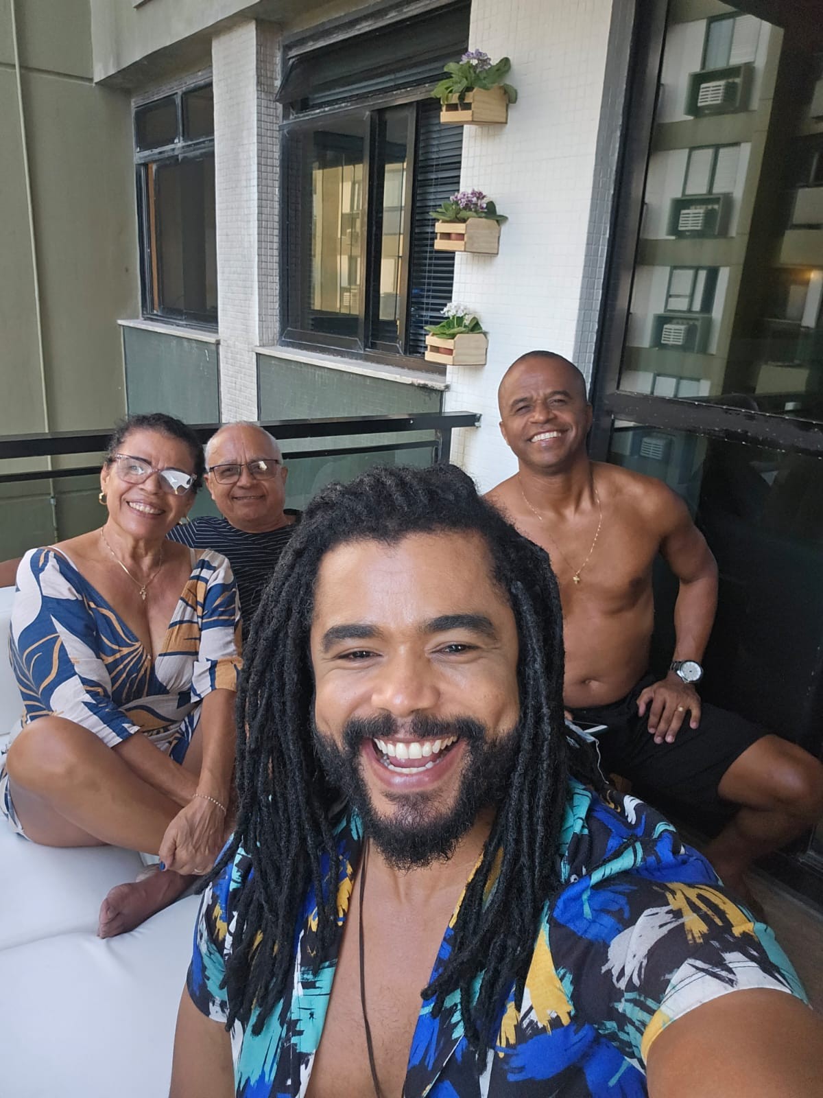 Diogo Almeida gosta de se reunir com os pais,entre eles Vilma,sua dupla no reality show,na varanda do seu apartamento. Ele decora com plantas — Foto: Divulgação