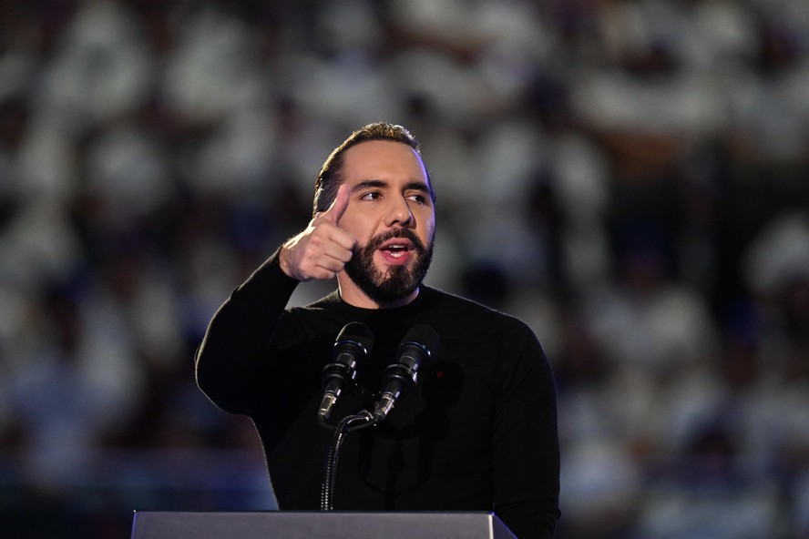 Presidente de El Salvador,Nayib Bukele,durante discurso em San Salvador — Foto: Marvin RECINOS / AFP