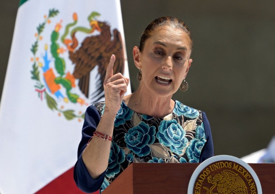 Presidente do México,Claudia Sheinbaum discursa durante um comício: economia do país sofre com tarifas de Trump — Foto: AFP