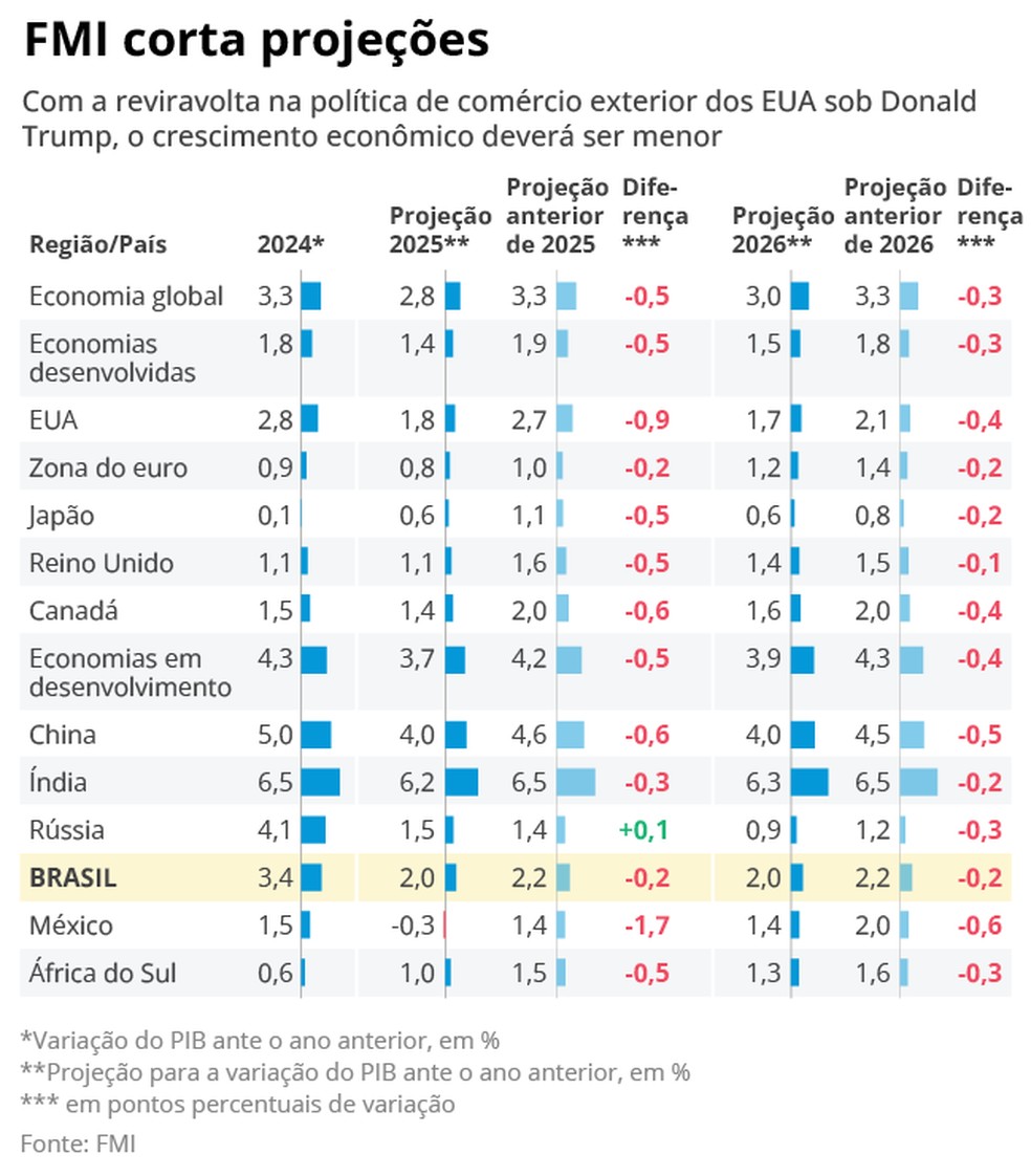 O Brasil passou relativamente ileso. O FMI projeta crescimento de 2,0% para a economia brasileira,tanto em 2025 quanto em 2026,2% para os dois anos,nas estimativas anteriores.