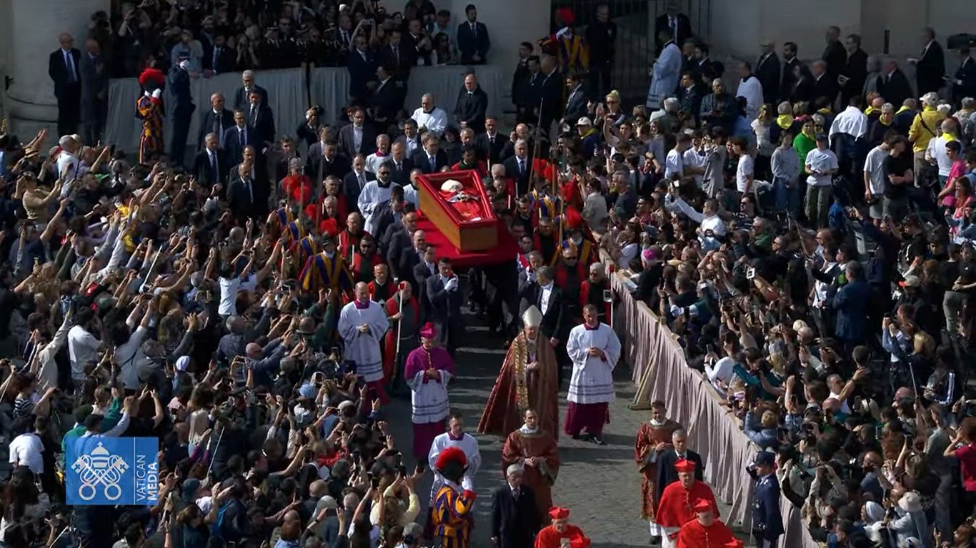 Procissão com caixão do Papa Francisco passa por corredor de fiéis na Praça São Pedro — Foto: Vatican Media/Reprodução