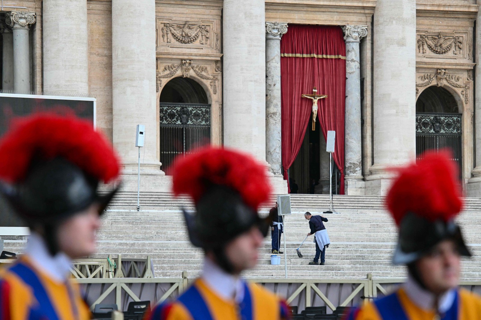 Guarda Suíça monta guarda em frente à Basílica de São Pedro,no Vaticano,antes da chegada do corpo de Francisco — Foto: Alberto Pizzoli/ AFP