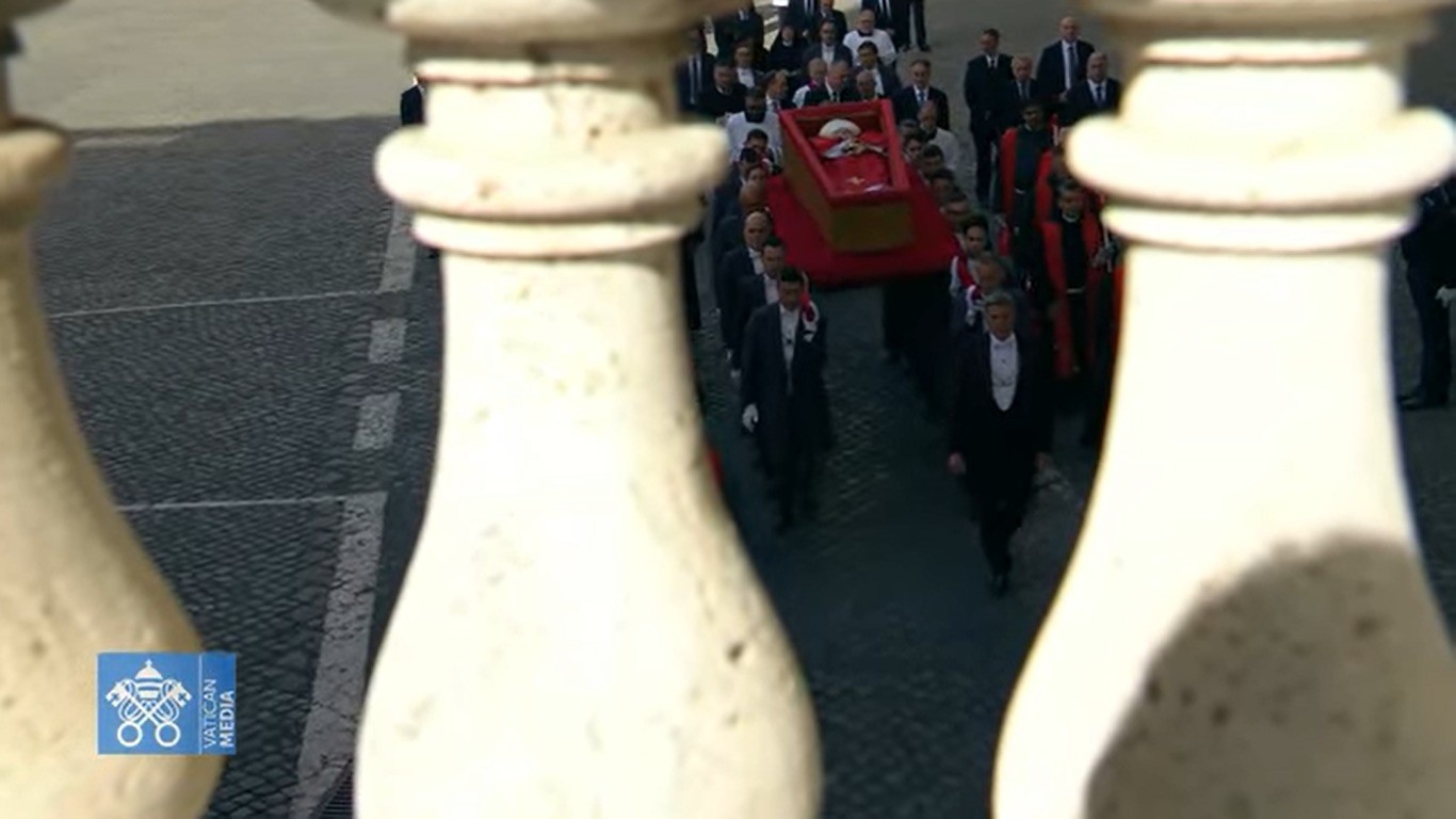 Caixão passa pelo Arco dos Sinos e entra na Praça São Pedro — Foto: Vatican Media/Reprodução
