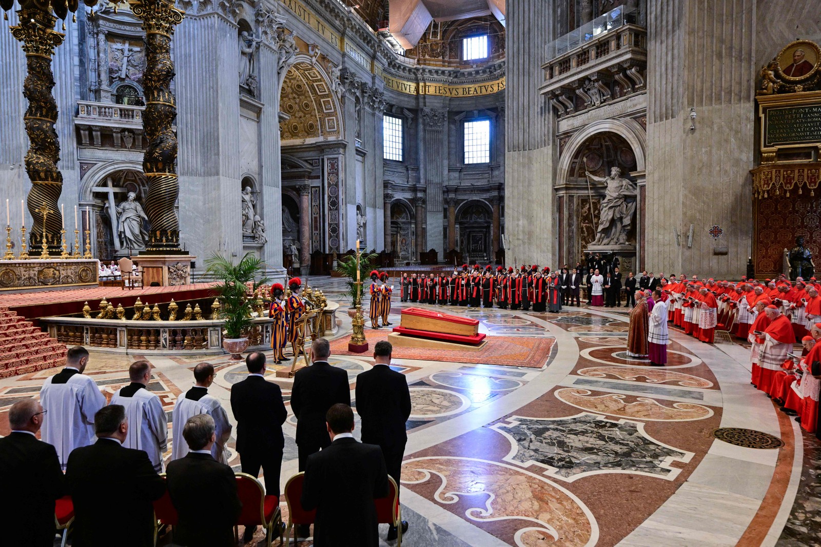 Caixão do Papa Francisco posicionado em frente ao Altar da Confissão da Basílica de São Pedro — Foto: Tiziana Fabi/AFP