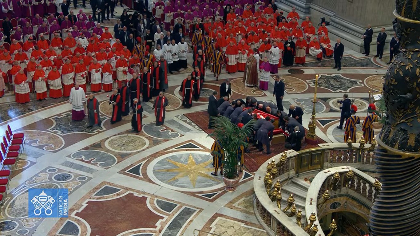 Corpo do Papa Francisco é posicionado do altar da Basílica de São Pedro — Foto: Vatican Media/Reprodução