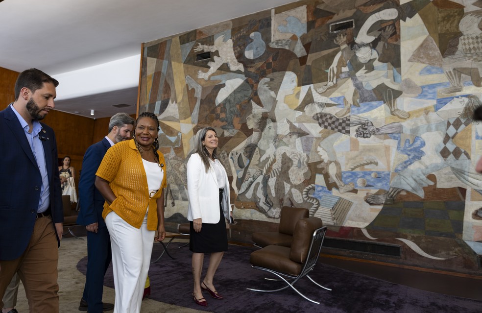 A ministra da Cultura Margareth Menezes e comitiva em visita ao Capanema. Ao fundo o painel Jogos Infantis de Cândido Portinari — Foto: Márcia Foletto