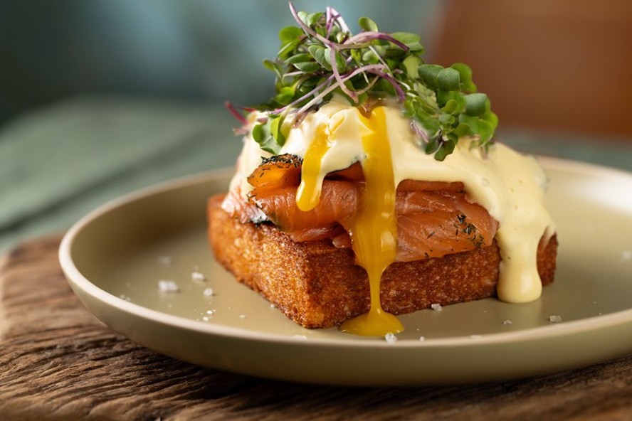 Beneditino de salmão gravlax com molho hollandaise do Guimas Bar & Brunch — Foto: Rodrigo Azevedo RESUMOSem tempo? Ferramenta de IA resume para você