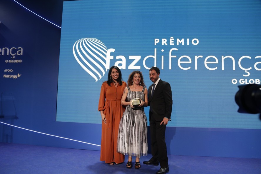 Telma Vinha,premiada na categoria Educação,recebeu o troféu das mãos de Katia Repsold,country manager da Naturgy,e do colunista Bernardo Mello Franco — Foto: Alexandre Cassiano
