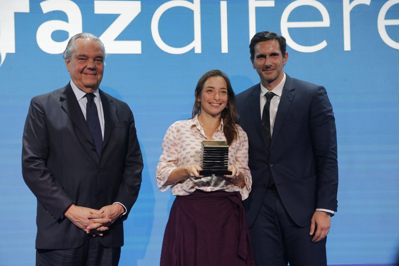 Categoria Desenvolvimento do Rio - Oficina Muda representada por Larissa Greven,sócia fundadora da empresa,é premiada com o Faz Diferença na categoria Desenvolvimento do Rio. Ela recebeu o troféu das mãos do diretor-geral da Editora Globo,Frederic Kachar,e do presidente da Firjan,Eduardo Eugenio Gouvêa Vieira. — Foto: Alexandre Cassiano