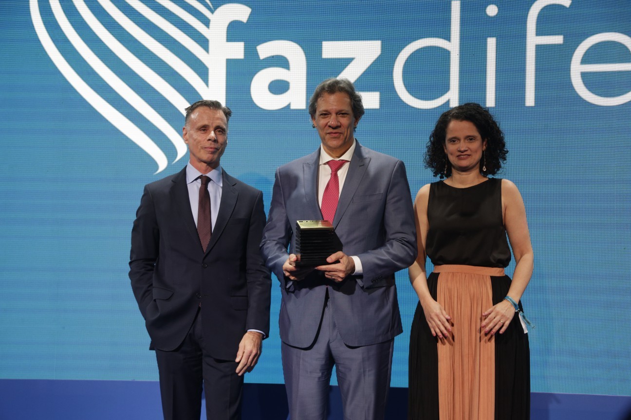 Categoria Economia - O ministro Fernando Haddad é premiado com o Faz Diferença na categoria Economia. Ele recebeu o prêmio das mãos da editora de Economia,Luciana Rodrigues,e do colunista,Lauro Jardim. — Foto: Foto: Alexandre Cassiano