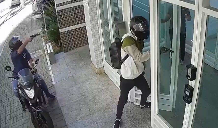Assaltantes estavam armados e usavam capacetes para não mostrar os rostos — Foto: Reprodução RESUMOSem tempo? Ferramenta de IA resume para você
