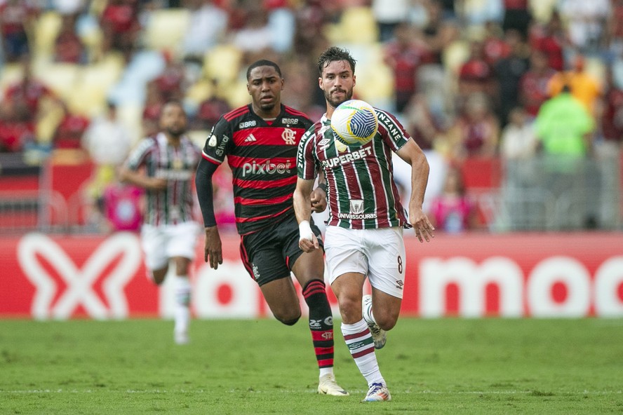 Martinelli e Lorran disputam bola no clássico no Maracanã entre Flamengo e Fluminense — Foto: Guito Moreto - Ag O Globo