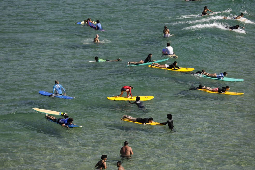Aula de surf no Arpoador no primeiro final de semana do inverno,com sol forte e praia cheia — Foto: Gabriel de Paiva /Agência O Globo