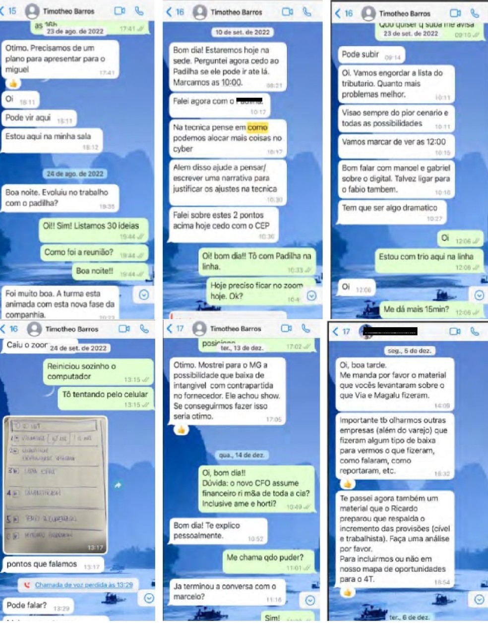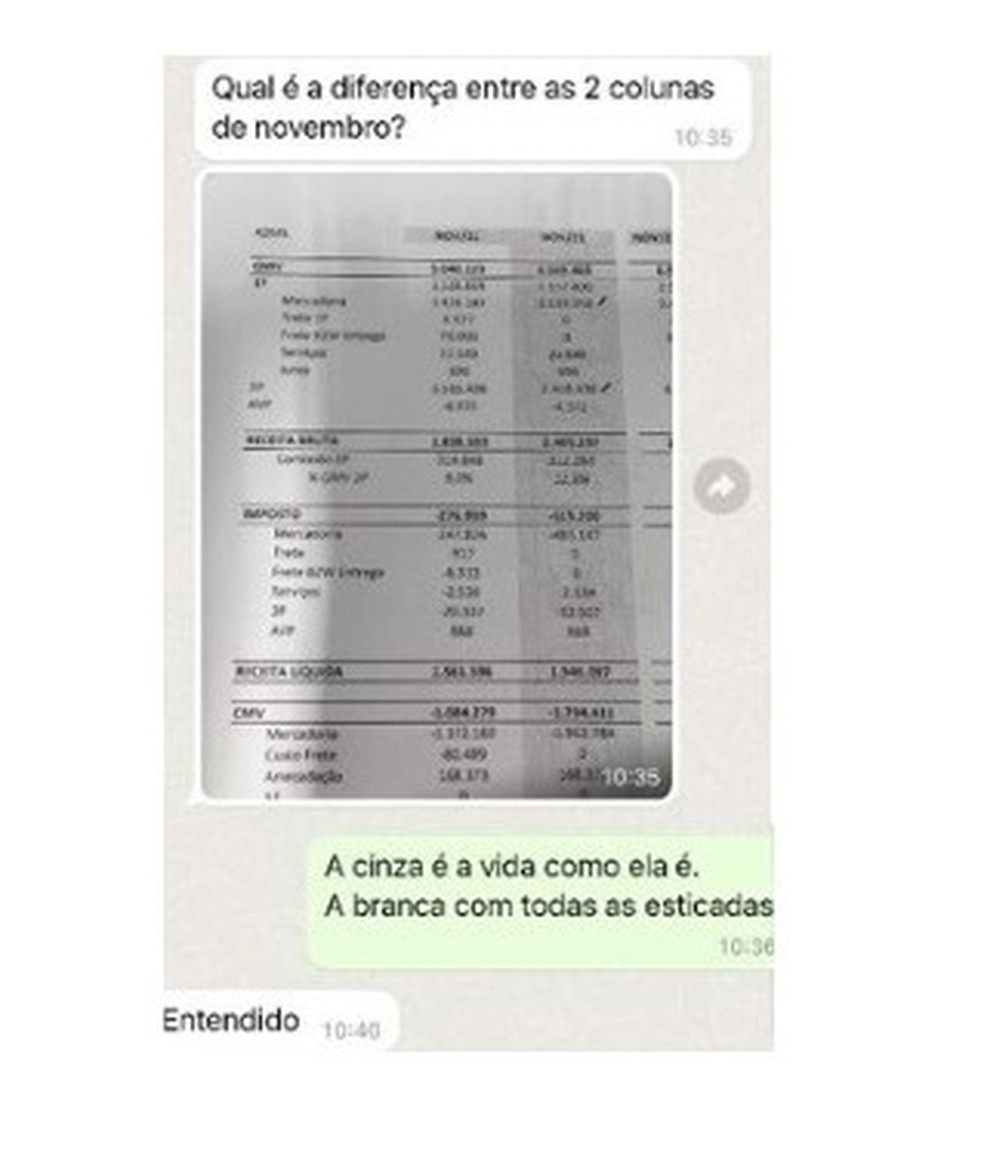 Outro elemento que o MPF aponta como importante é uma conversa de WhatsApp entre diretores da empresa. No diálogo,Marcelo Barros “reproduz a foto de uma demonstração financeira e pergunta qual a diferença entre as duas colunas de novembro”. José Timotheo de Barros,então,responde: “A cinza é a vida como ele é. A branca com todas as esticadas”. A coluna apontada como verdadeira possui números menores que a “esticada”.