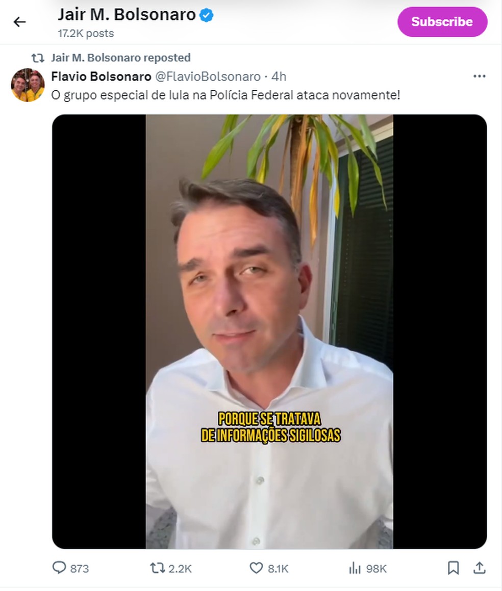A investigação aponta que o esquema para proteger Flávio funcionava a mando de Ramagem,aliado do ex-presidente Bolsonaro. Em outra reação nas redes,dessa vez por vídeo,o senador se diz vítima e acusa “o grupo especial de Lula na PF” de atacar novamente: